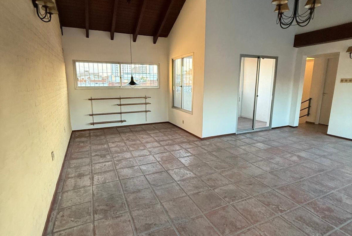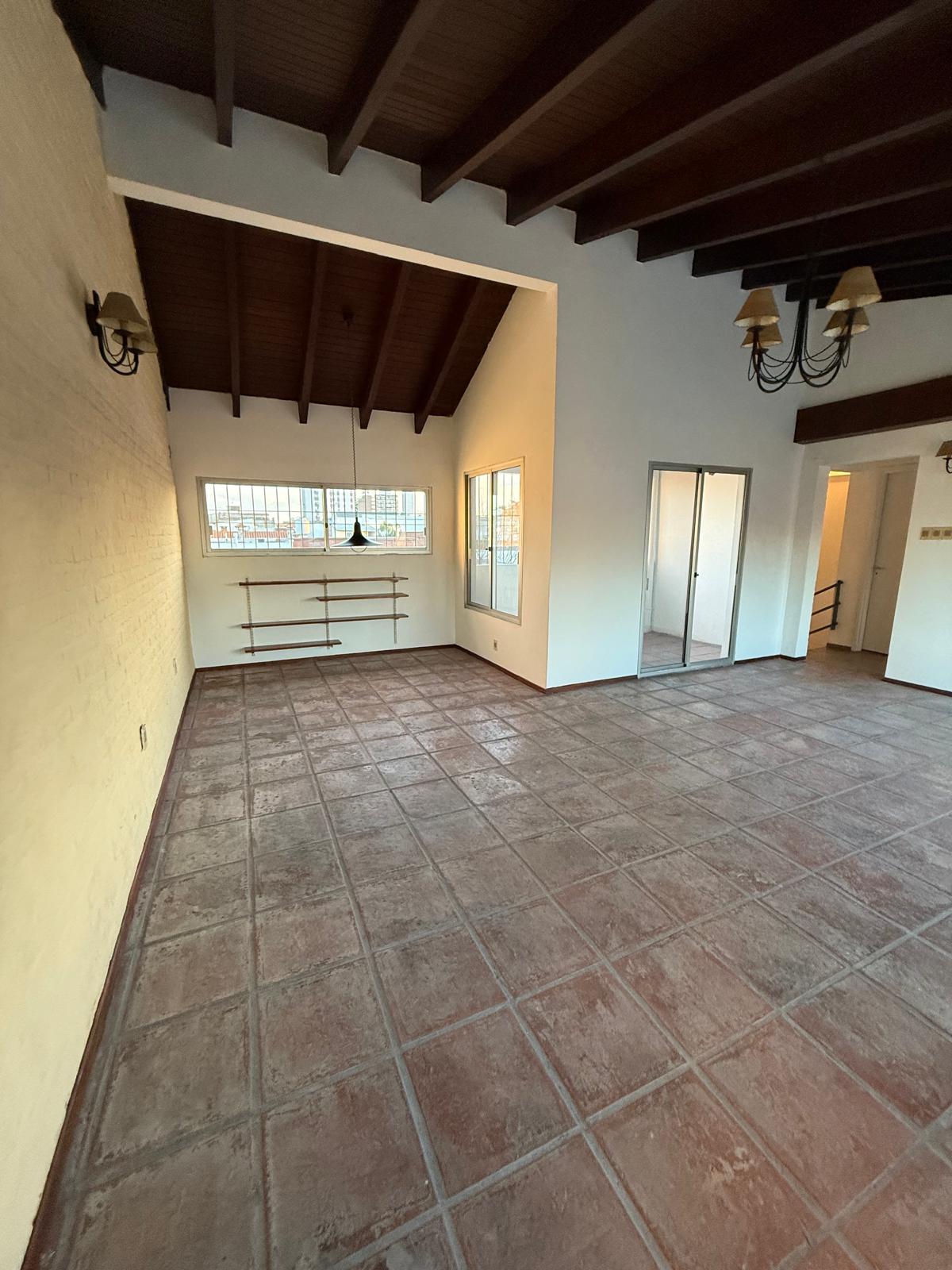 Amplio Líving comedor con estufa a leña y cocina integrada con placares, buhardilla y aire acondicionado.